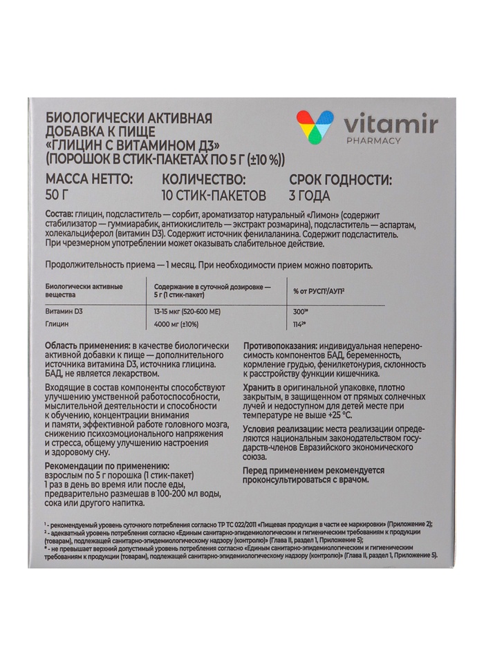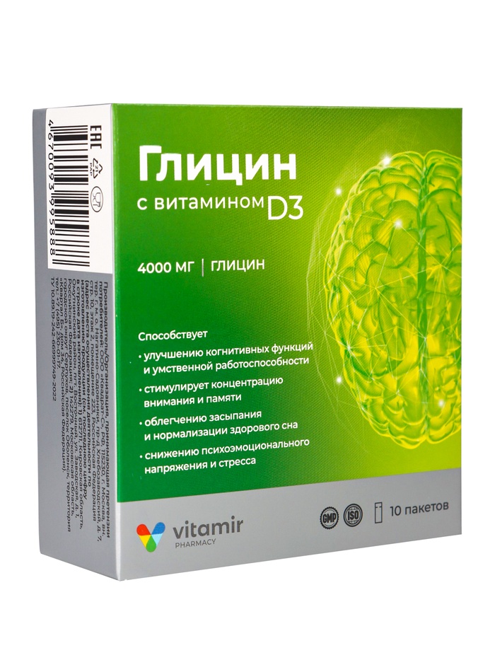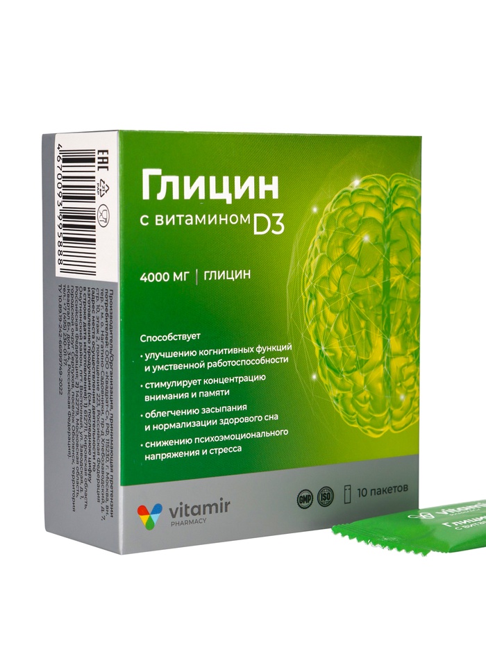 Глицин с витамином D3 «Витамир» TETRALAB — надёжная поддержка мозга, сна и иммунитета. Подходит для регулярного применения, способствует улучшению когнитивных функций, качественного сна и укреплению защитных сил организма.