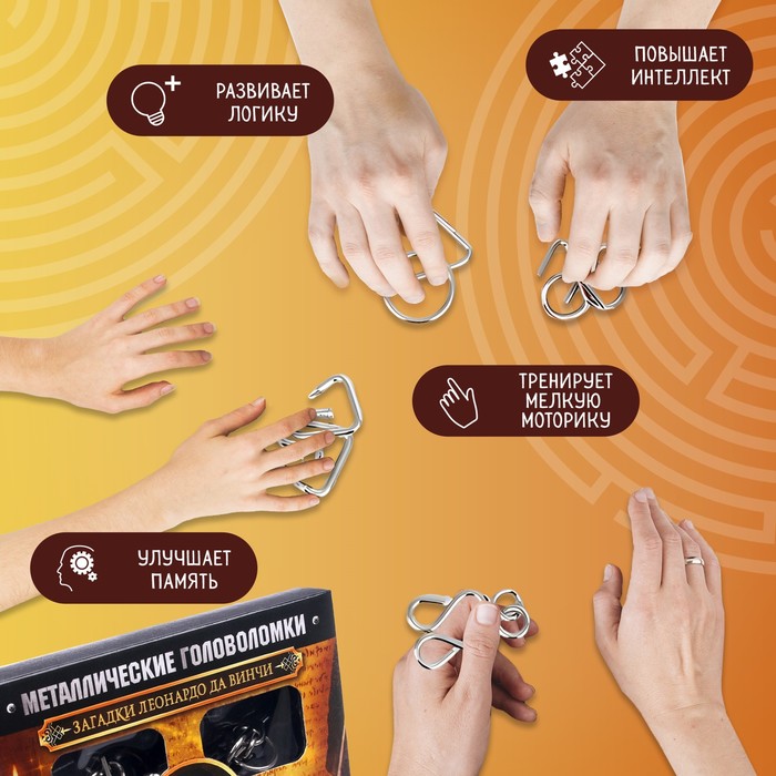 Металлические головоломки «Загадки Леонардо Да Винчи» — это увлекательный набор для любителей логических задач. В комплекте представлены различные головоломки, которые заставят размышлять, анализировать и находить нестандартные решения. Такой формат отлично подходит как для детей, так и для взрослых, ведь тренировка ума полезна в любом возрасте.