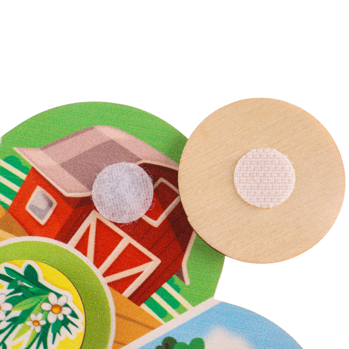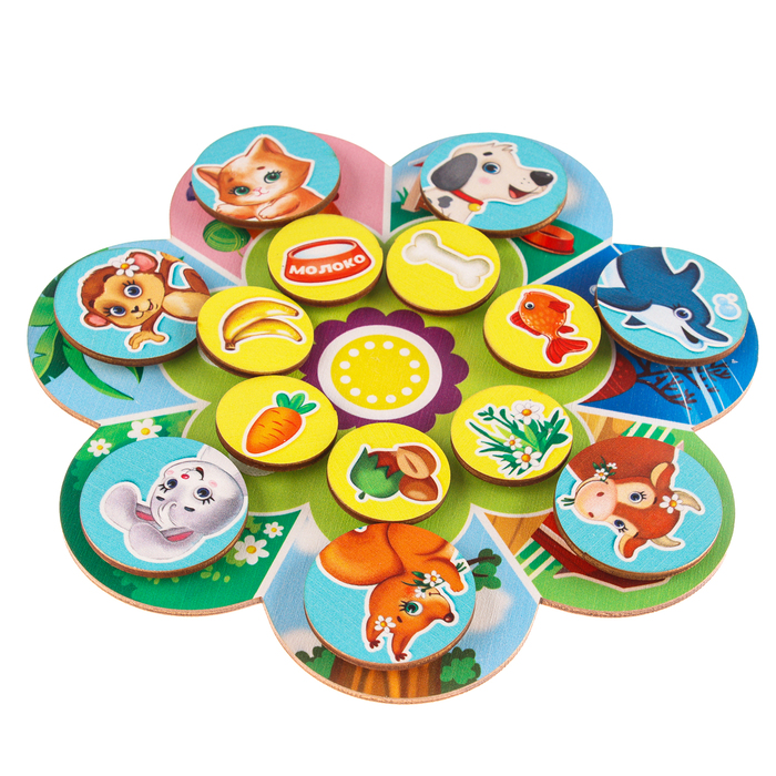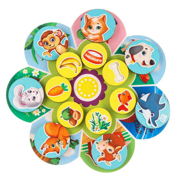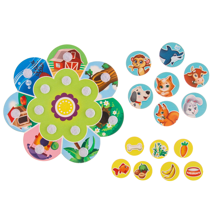 Перед началом игры освободите круг от липучек, попросите малыша назвать всех животных и элементы, обозначающие еду. Затем дайте ребёнку самостоятельно прикрепить животное к месту его обитания. Когда малыш будет брать липучку с каким-то животным, спросите, что он о нём знает, где встречал/видел.