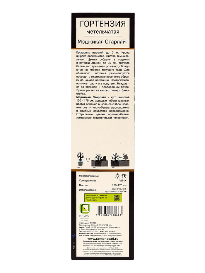 Гортензия Мэджикал Старлайт является типичным представителем семейства камнеломковых. Данное растение имеет высоту и ширину до 2,0 м. Куст не разваливается и не требует опор и подвязывания. Молодые побеги имеют красный цвет, с возрастом они деревенеют, становясь коричневыми. Цветет на побегах текущего года. У гортензии Мэджикал Старлайт листья крупные, зеленые, с острой вершиной. Крона вырастает в виде полусферы. Цветы звездчатой формы, ослепительно белые, около 4 см в диаметре. Соцветия рыхлые, конусовидные, до 20 см высотой. Цветение в Сибири с июня по сентябрь.