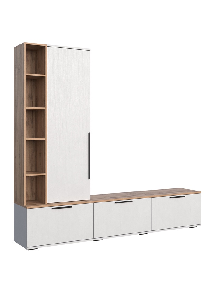 Включает три распашные ниши для хранения ТВ принадлежностей, четыре открытых полки для книг и сувениров, закрытый шкафчик с четырьмя вместительными полками. Обеспечивает гибкость в использовании пространства.