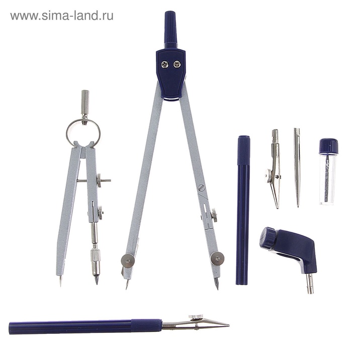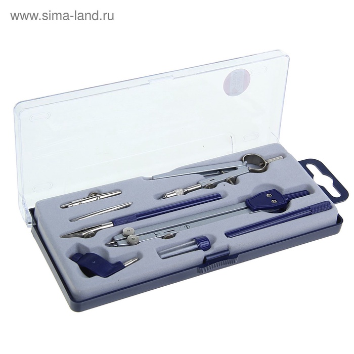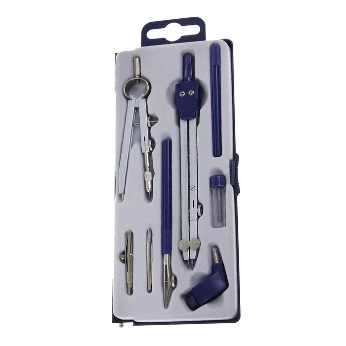 Готовальня 8 предметов: 2 циркуля 150 мм, 105 мм, 2 удлинителя, грифель, 2 рейсфедера, центрик, держатель для карандаша, в пластиковом пенале