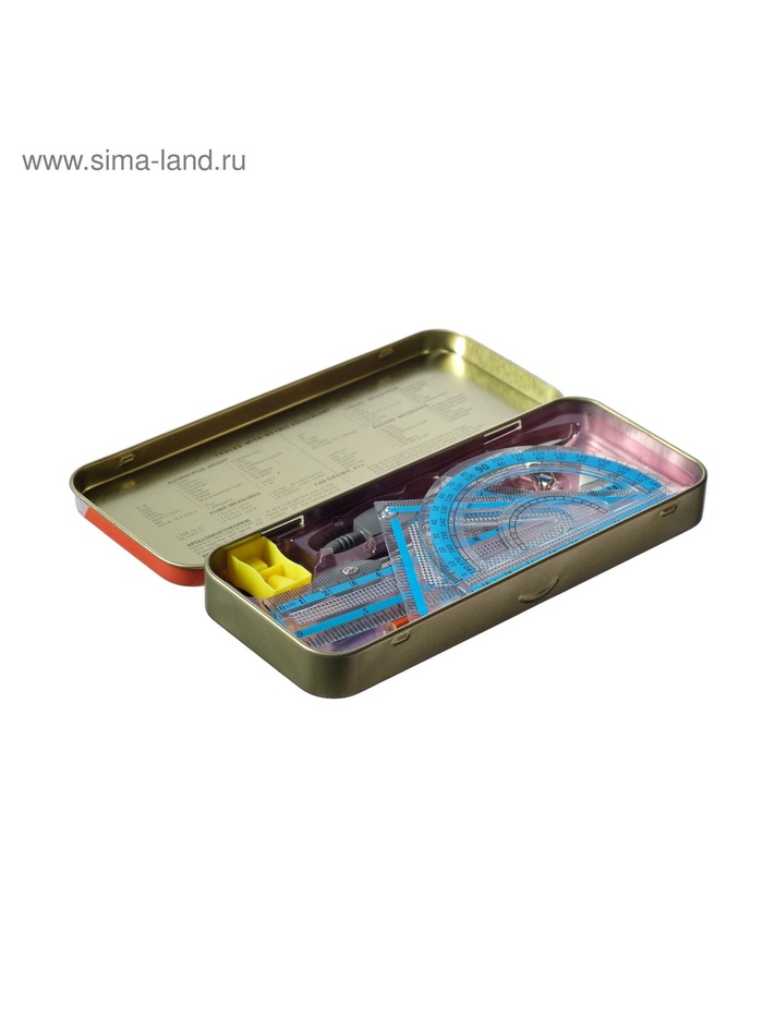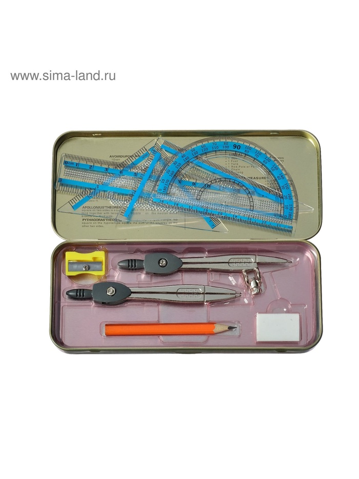 Готовальня 9 предметов: 2 циркуля 120 мм, угольник 60×30×90 мм, угольник 45×45×90 мм, линейка 15 см, транспортир, ластик, точилка, в металлическом пенале