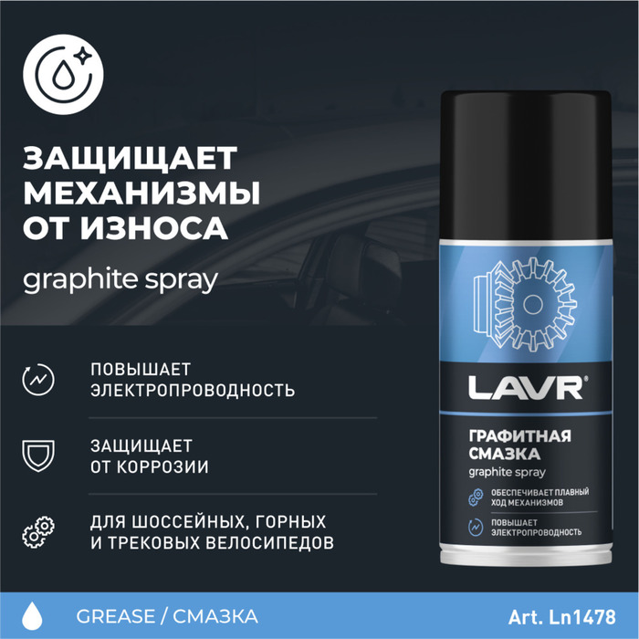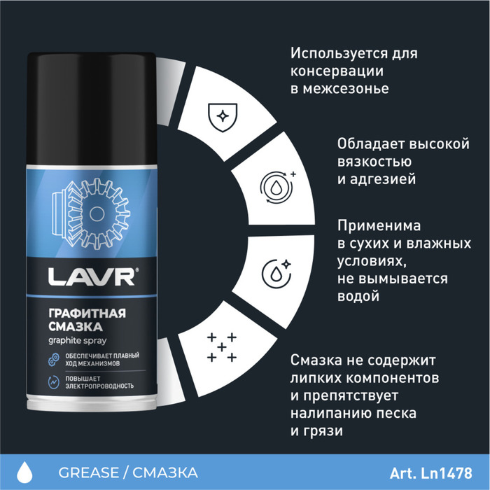Смазка защищает механизмы от износа, трения и коррозии. Мелкодисперсный графит сохраняется в узле длительное время, обеспечивая антифрикционные свойства. Смазка вытесняет влагу и создает электропроводное покрытие. Применяется для обработки деталей автомобилей, тросов, резьбовых соединений, ходовых винтов, рессор, тихоходных подшипников, индустриального оборудования и других механизмов.