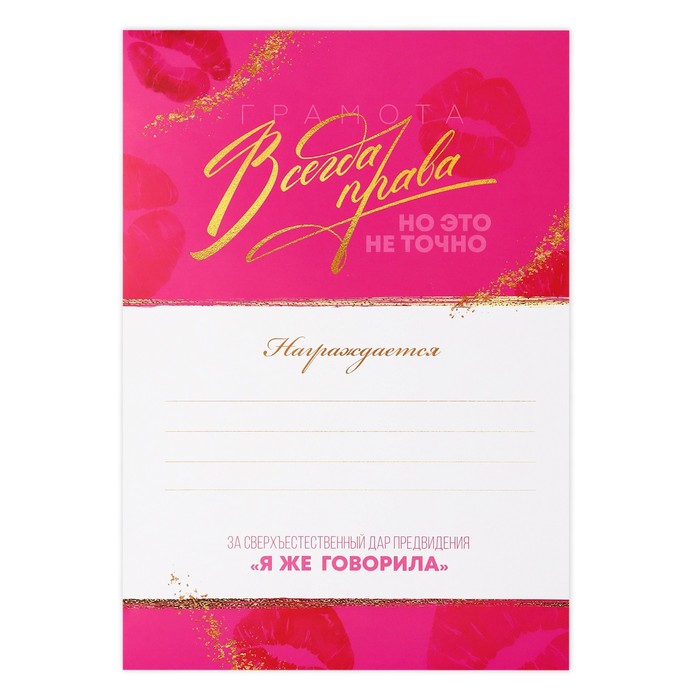 Грамота А4 с приколом «Всегда права», 18+, 157 гр/кв.м