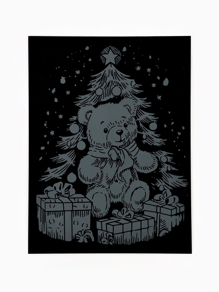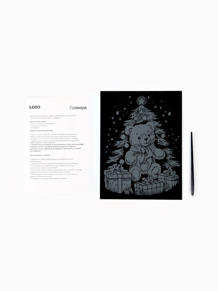 На чёрную основу уже нанесён белый контур рисунка. Задача ребёнка аккуратно процарапать штихелем белые контуры, чтобы получить яркую картинку!
