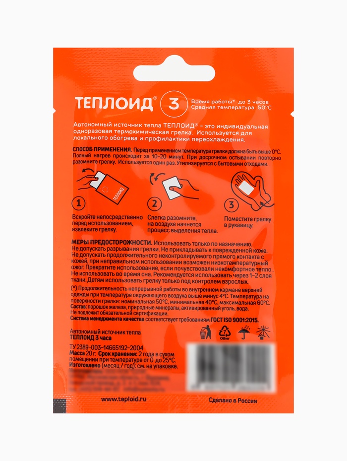Автономный источник тепла "Теплоид" - это одноразовая грелка, которая не нуждается в электричестве или топливе, генерируя тепло автономно. Обычно его размещают во внутренних карманах одежды, в рукавицах, обуви.