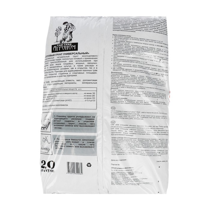 Высококачественный натуральный грунт многоцелевого назначения на основе торфа, полностью готовый к применению и прекрасно приспособленный для использования при выращивании рассады всех видов плодовых, ягодных, овощных, цветочных и декоративных культур открытого и защищенного грунта. Обеспечивает оптимальные условия для повышения всхожести семян, лучшей приживаемости рассады, улучшения эстетических качеств цветочных и декоративных культур. Возможно применение в качестве подкормки.