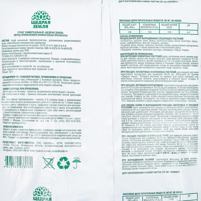 Грунт универсальный Щедрая земля - готовый к применению универсальный питательный грунт с минеральными удобрениями.