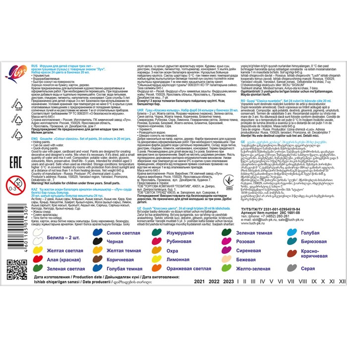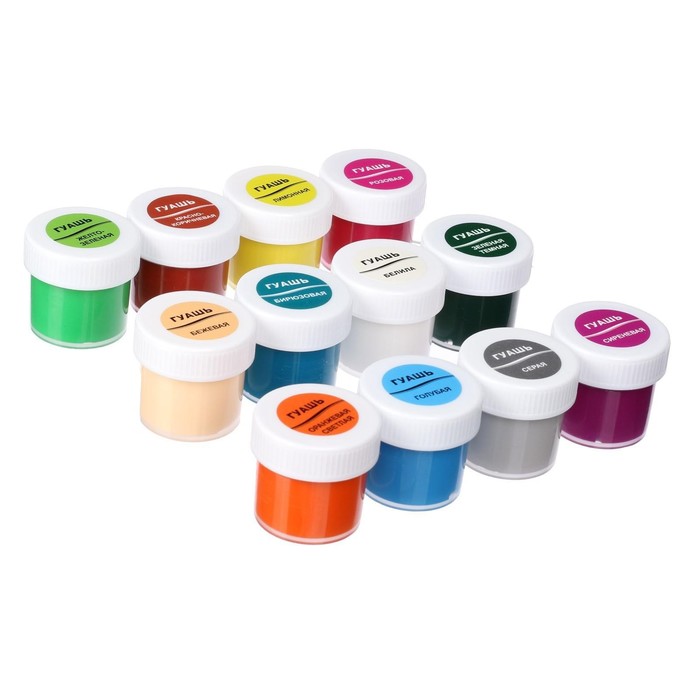 Гуашь для детского творчества, для выполнения художественно-декоративных и оформительских работ. Краски изготовлены на основе натуральных компонентов и высококачественных пигментов. На крышке имеется яркая этикетка с указанием цвета краски - удобство для покупателя, который сразу понимает, какой цвет ему нужен. Краске присущи яркие, красивые, чистые цвета, которые хорошо смешиваются, позволяя получать новые чистые цвета и оттенки. Гуашь имеет отличную укрывистость, при высыхании не выцветает, приобретает бархатистую поверхность. Гуашь легко смывается с рук и одежды и не имеет неприятного запаха. Безопасна для детского творчества, что подтверждено сертификатами (ЕАС).