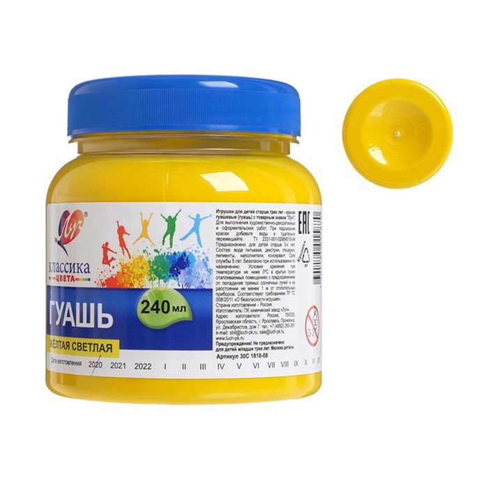 Краска изготовлена на основе натуральных компонентов и высококачественных пигментов. Предназначена для выполнения художественно-декоративных работ. Характеристики:Оптимальная консистенция и однородность (краска не жидкая и не загустевшая, не засохшая); герметичная упаковка предотвращает краску от высыхания (проводятся регулярные испытания на герметичность)краске присущи яркие, красивые, чистые цвета; краска хорошо смешивается с другими цветами, позволяя получать новые чистые цвета и оттенки; гуашь имеет отличную укрывистость; при высыхании краска не выцветает, приобретает бархатистую поверхность; гуашь легко смывается с рук и одежды; не имеет неприятного запаха; безопасна для детского творчества, что подтверждено сертификатами (ЕАС), проверяется на безопасность в соответствии с законодательством РФКраска имеет стабильную рецептуру(срок службы 5 лет).