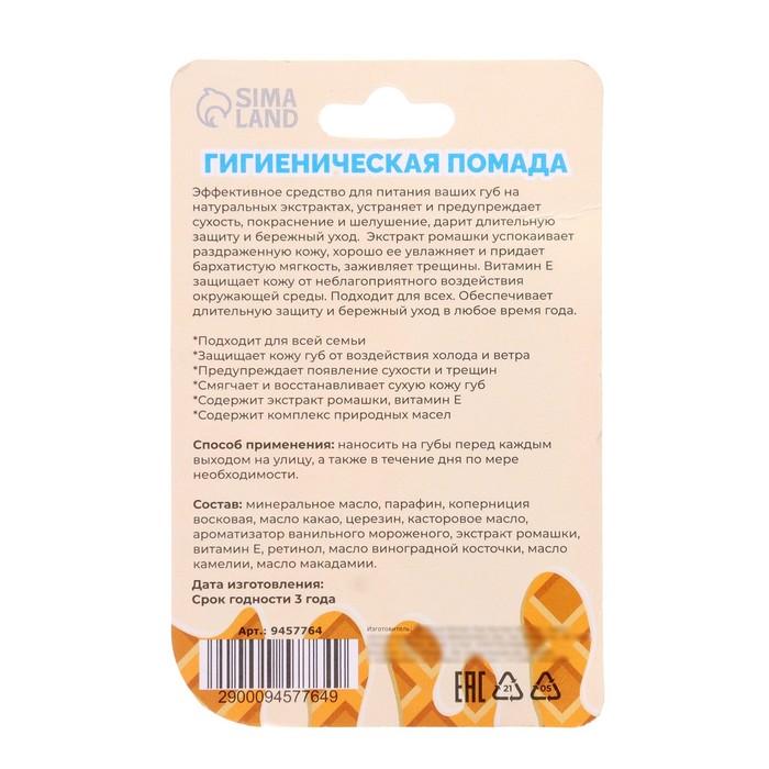 Состав: минеральное масло, парафин, коперниция восковая, масло какао, церезин, касторовое малос, ароматизатор ванильного мороженого, экстракт ромашки, витамин Е, ретинол, масло виноградной косточки, масло камелии, масло макадамии.
