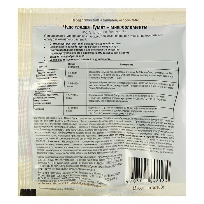 Состав: калиевые и/или натриевые соли гуминовых кислот – 75%, микроэлементы Mg, S, B, Cu, Fe, Mn, Mo, Z
