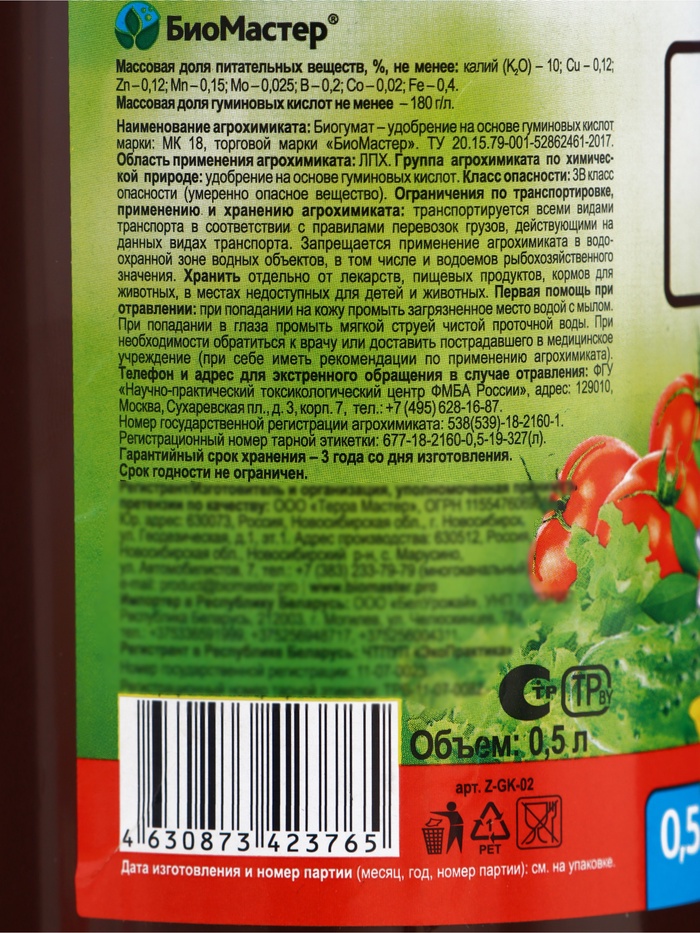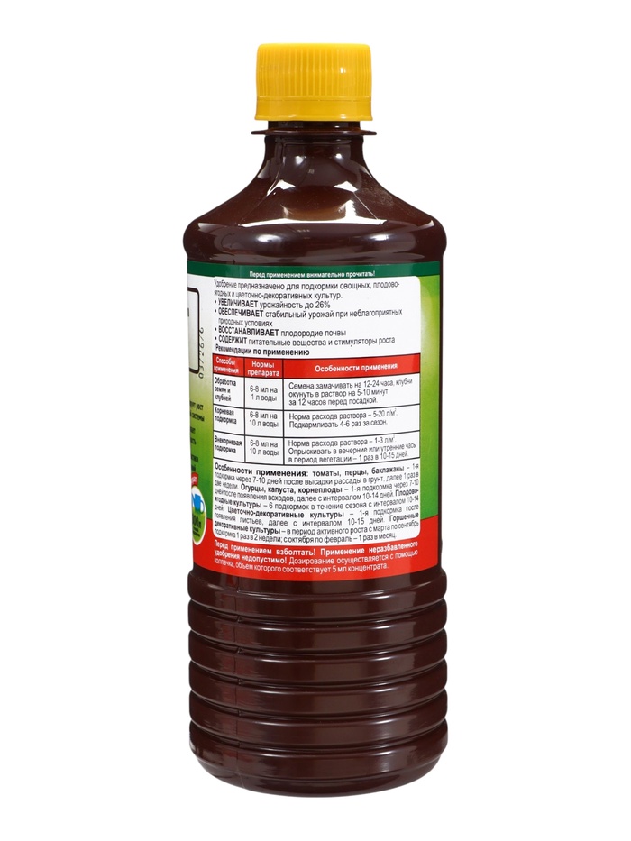 Насыщенное микроэлементами средство быстро восстанавливает плодородность земли, развивает почвенную микрофлору. Безопасно для человека, животных, пчёл и окружающей среды. Из 0,5 концентрата выходит 800 л подкормки.