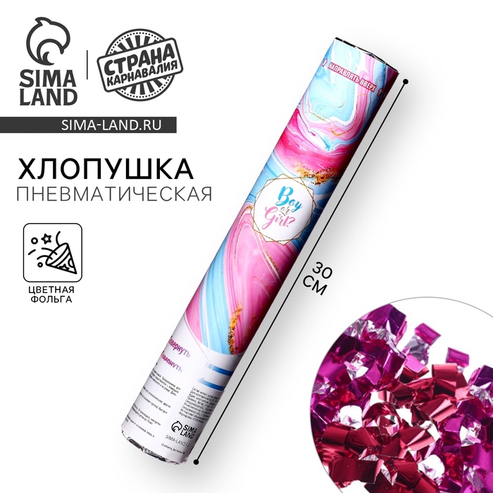 Гендер пати — популярный праздник, который устраивают родители в ожидании пополнения. Пневматическая хлопушка поможет эффектно объявить пол будущего малыша на этом празднике! Она подарит массу положительных эмоций для всех гостей.