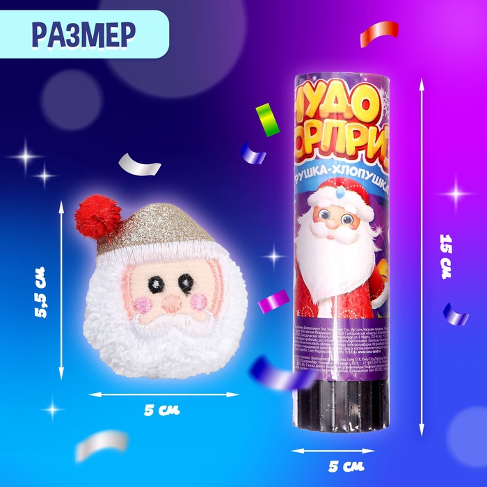 Хлопушка с игрушкой «Чудо-сюрприз. Дед Мороз» — это идеальный атрибут для создания праздничной атмосферы на вечеринке по случаю Нового года. Изделие размером 5 × 15 см наполнено цветной фольгой. Внутри хлопушки вас ждёт замечательная мягкая игрушка размером 5 × 5,5 см. Лёгкий и безопасный механизм активации позволяет использовать хлопушку в помещении и на улице.