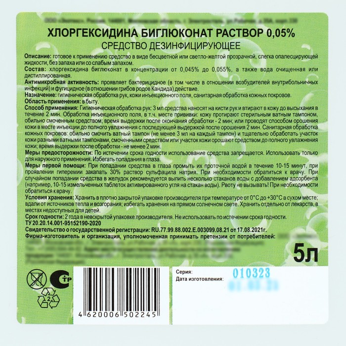Хлоргексидина биглюконат раствор 0,05% средство дезинфицирующее, 5 л