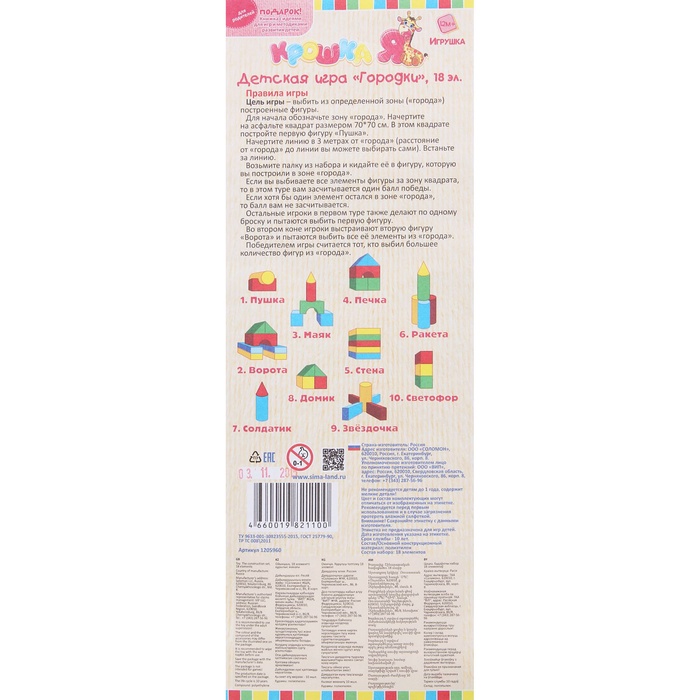 Игровой набор "Городки" от ТМ «Крошка Я» воплотит в жизнь архитектурные фантазии вашего малыша. С его помощью он научится строить дома и мосты, возводить высокие башни и небольшие сооружения.