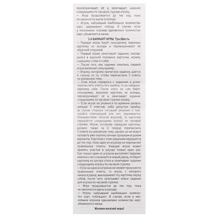 Это захватывающая и увлекательная игра, которая позволяет проверить свои навыки в быстром мышлении, логике и словарном запасе. Состоящая из 55 карточек, эта игра предлагает уникальный опыт и развивает не только интеллектуальные способности, но и коммуникативные навыки. Каждая карточка в игре "Быстрословы" содержит различные слова и фразы, которые игроки должны использовать для составления своих ответов. Цель игры заключается в том, чтобы как можно быстрее придумать слово или фразу, начинающуюся на последнюю букву слова, указанного на предыдущей карточке. Игроки должны быть быстрыми и творческими, чтобы придумывать новые слова и не повторяться."Быстрословы" подходит для игры как в кругу семьи или друзей, так и на вечеринках или в командной соревновательной форме. Эта игра способствует развитию речи, памяти, внимания и быстроты мышления. Кроме того, она помогает расширить словарный запас и улучшить коммуникативные навыки. В "Быстрословах" каждый игрок имеет возможность проявить свою креативность и остроумие, придумывая оригинальные и необычные слова. Благодаря разнообразию карточек, игра никогда не становится однообразной или предсказуемой. Каждый раунд предлагает новые вызовы и возможности для проявления своих способностей. Благодаря простым правилам и интересному геймплею, игра легко усваивается и подхоит всем возрастным группам. Выводя на новый уровень вашу способность быстро мыслить и находить оригинальные решения, карточная игра "Быстрословы" обещает множество часов увлекательного и интеллектуального развлечения. Увлекательная кооперативная игра, которая позволит вам применить логику и научиться работать в команде!