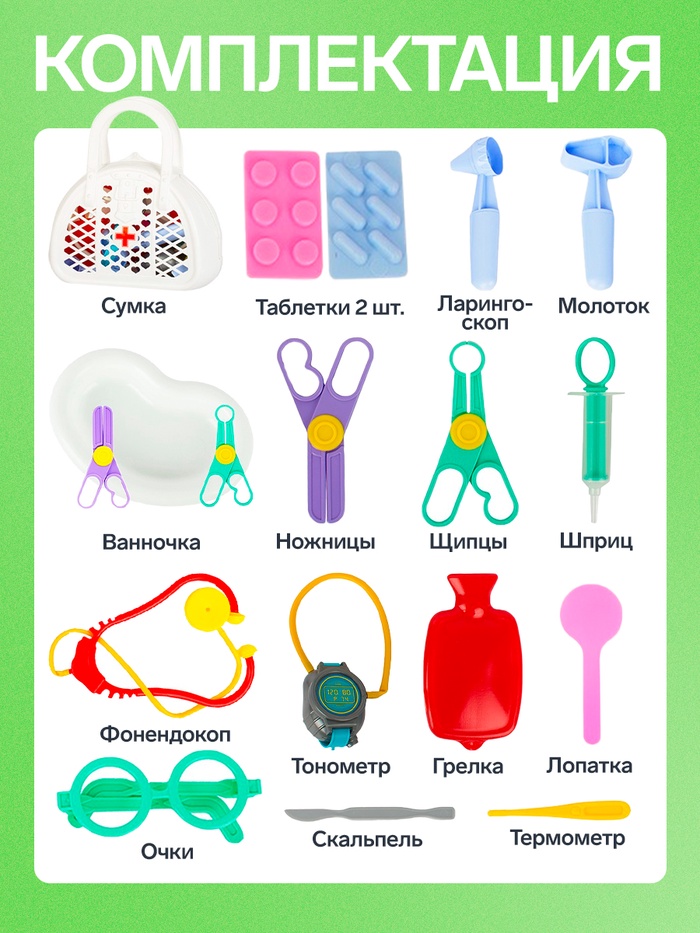 Игровой набор «Доктор № 3» — это полный набор аксессуаров для создания увлекательной ролевой игры во врача. В набор входят 16 предметов, упакованных в удобную сумку.