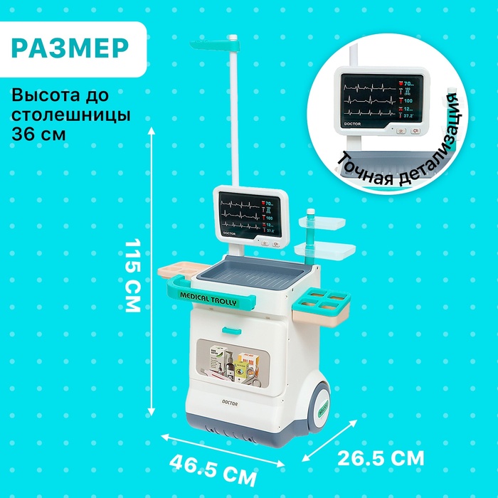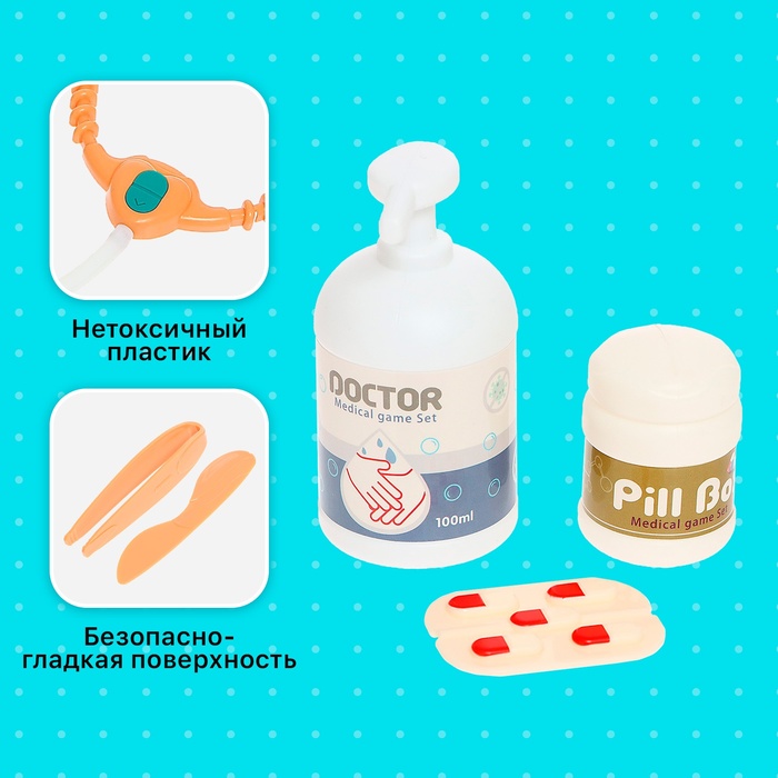 - 26 предметов, включая игрушечный стетоскоп, шприц, термометр и другие инструменты.