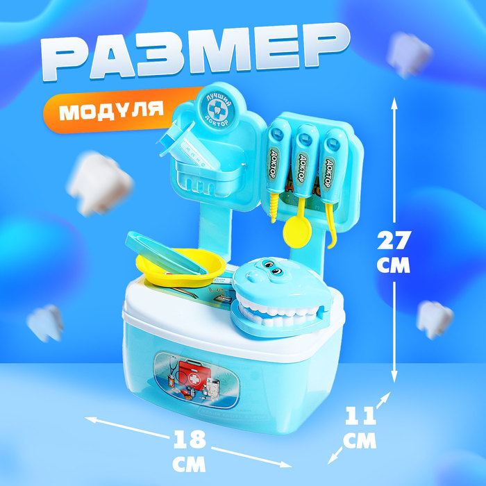 В набор входят инструменты и игровые карточки. Ребёнок узнает о строении челюсти, названия зубов и правила гигиены полости рта.
