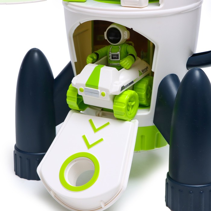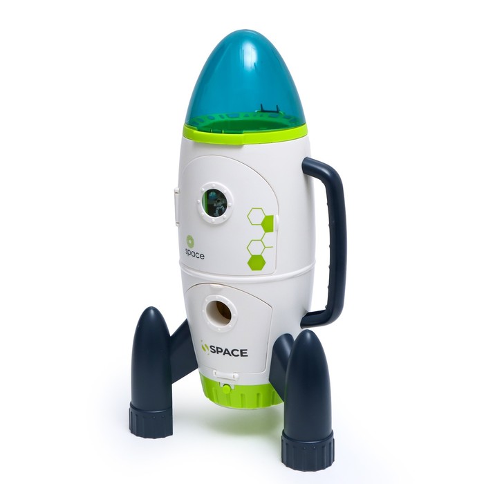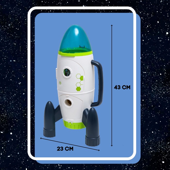 - Есть световые и звуковые эффекты: нажмите на зелёную кнопку, и появится свет, звук отсчёта и запуска ракеты. Для работы необходимо 2 батарейки типоразмера AAА (в комплекте).