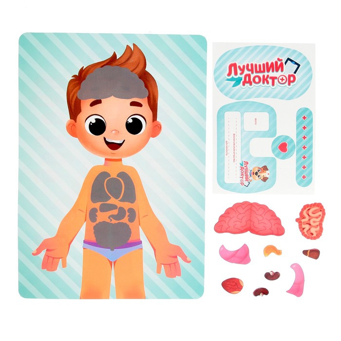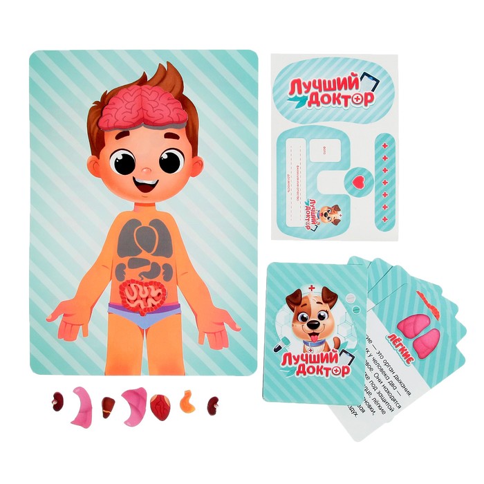 - Есть карточки с изображением органов, которые можно приложить к с соответствующим теням на карточке с человеком.