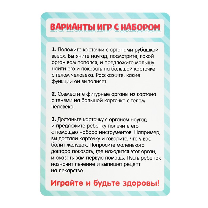 - Достаньте наугад карточку с органом и предложите ребёнку полечить его с помощью набора инструментов. Например, вы достали карточку и говорите, что у вас болит желудок. Попросите маленького доктора показать, где находится этот орган, и оказать вам первую помощь. Пусть ребёнок назначит лечение и выпишет рецепт на лекарство.