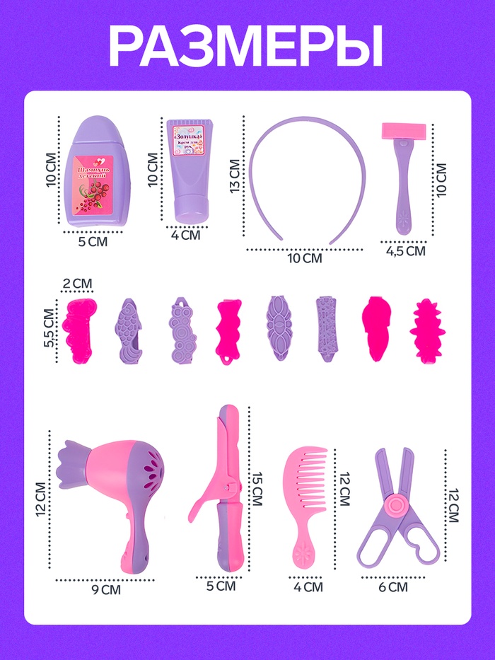 Игровой набор «Парикмахер» № 2 — это набор аксессуаров для игры в парикмахера. В комплект входит расческа, ножницы, плойка, бритвенный станок, фен, ободок, заколка в количестве 8 штук, бальзам для волос, шампунь и крем. Все предметы изготовлены из качественной пластмассы.