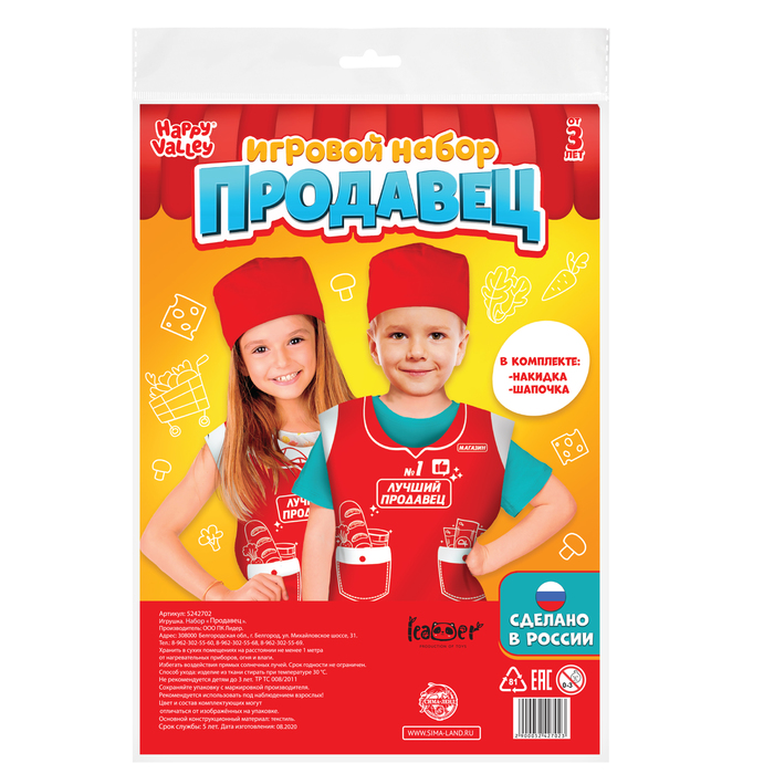 Игра в продавца учит ребёнка считать, общаться и фантазировать. Накидку используют на творческих занятиях с сухими материалами — он защитит одежду во время лепки или рисования. Набор подходит мальчикам и девочкам от 3 лет.