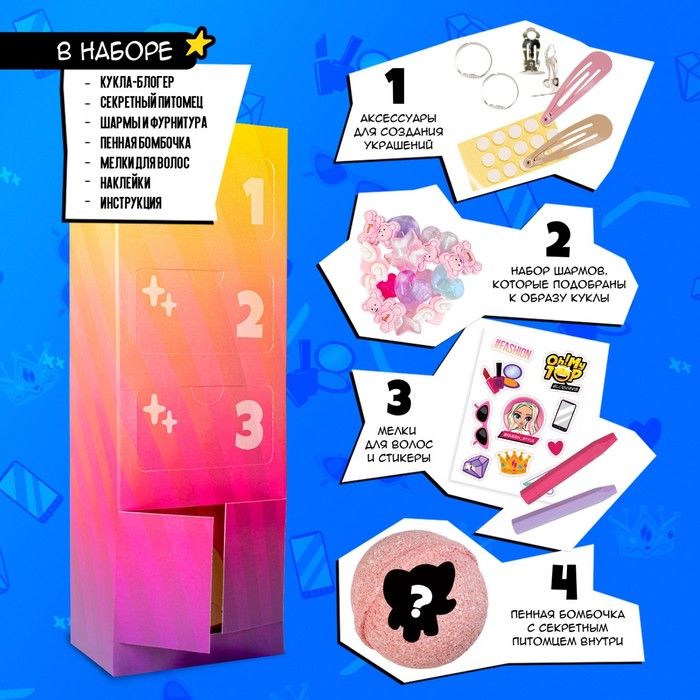 Уникальный набор шарнирных кукол с DIY украшениями! Ребёнок сможет самостоятельно сделать себе украшения из шармов, добавить яркости с помощью мелков для волос, декорировать различные поверхности стикерами.