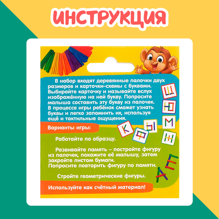 Обучающий набор «Изучаем буквы» подходит для малышей от 3 лет. Он включает деревянные палочки двух размеров и карточки-схемы с буквами. Палочки выполнены из натурального дерева, приятны на ощупь и абсолютно безопасны для ребёнка.