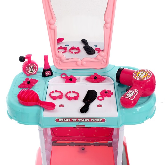 Уголок маленькой принцессы включает столик с зеркалом, бижутерию, аксессуары, фен, расчёски. Зеркало из фольгированной плёнки не искажает изображение. Фен работает от батареек.
