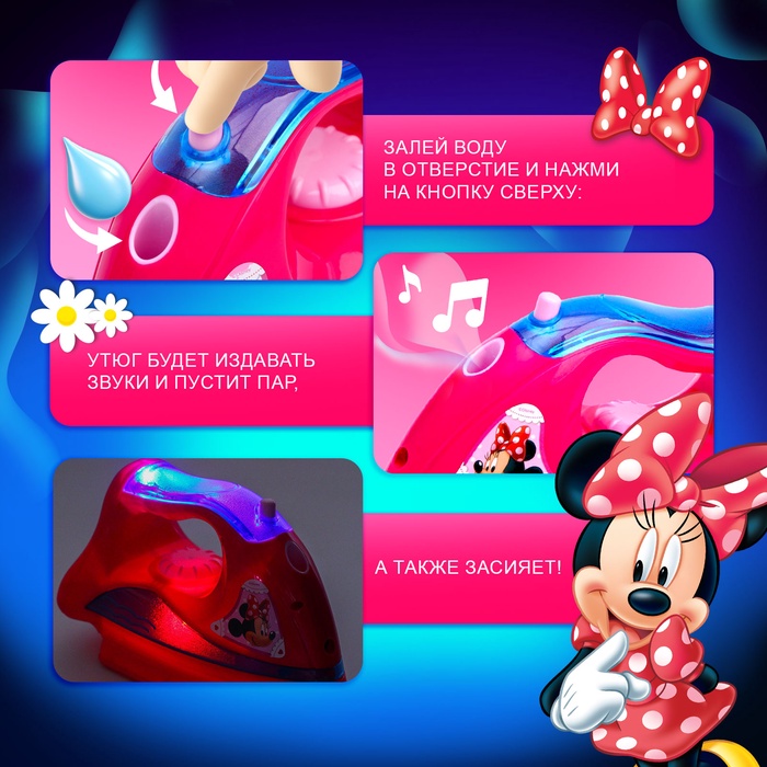 Утюг Минни станет незаменимым прибором в детской комнате.А со звуковыми и световыми эффектами играть будет еще интереснее