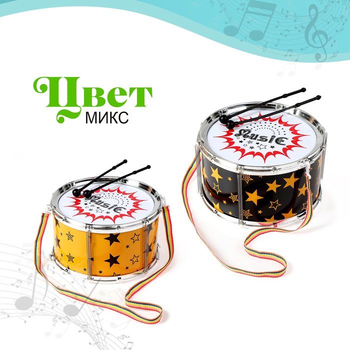Барабан обтянут полотном с двух сторон, есть текстильная лямка. Игрушку удобно носить на шее и везде брать с собой.