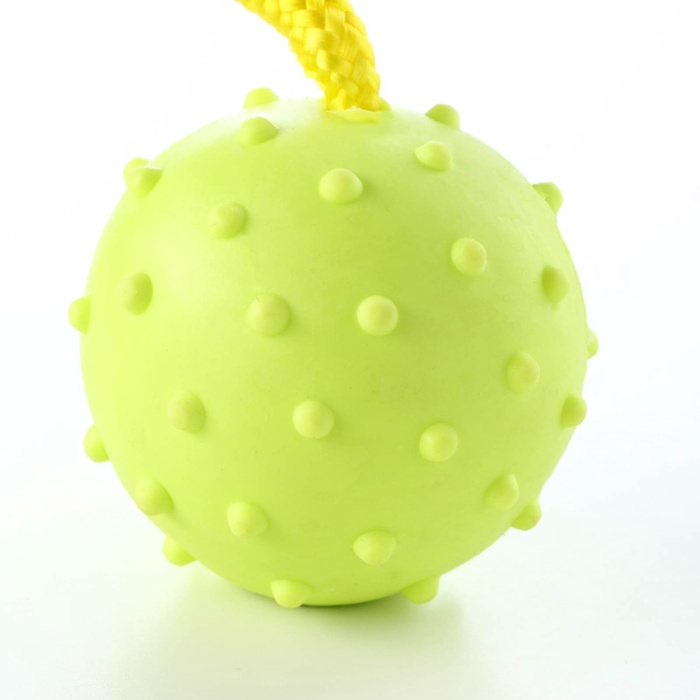- Удобство броска и подачи: Прочная текстильная верёвка служит ручкой. Это помогает кинуть мяч далеко, даже мокрыми руками, и подать его питомцу, не нагибаясь до земли.