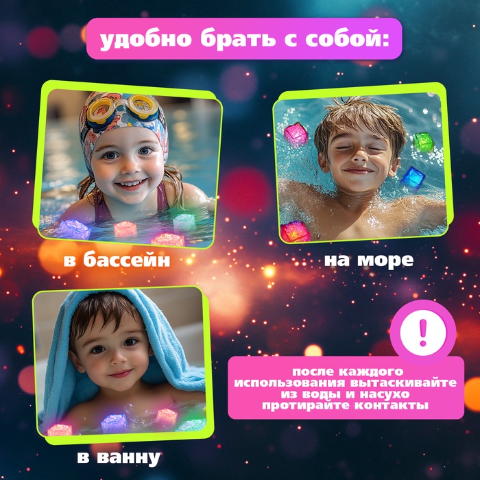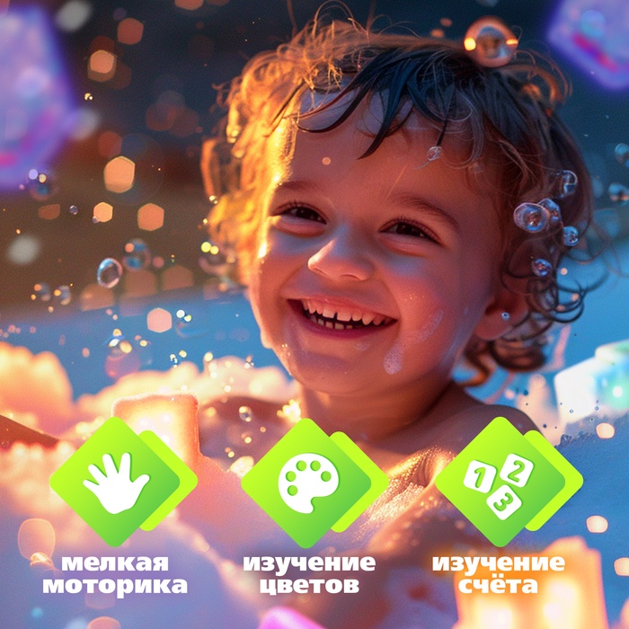 Светящиеся кубики понравятся и мальчикам, и девочкам. Помогают развивать моторику, цветовосприятие и тактильные ощущения. Идеальный вариант для первого знакомства с водными играми — безопасно, удобно и увлекательно. Подарите малышу радость от купания с волшебными огоньками!