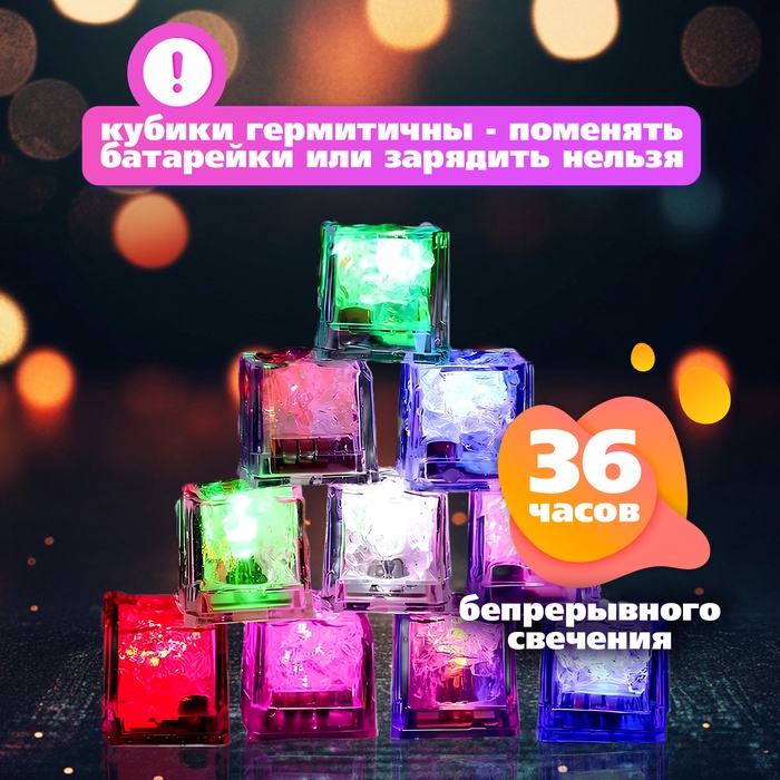 - 12 разноцветных кубиков. Играйте, стройте башни или просто наблюдайте, как вода зажигает мягкое свечение.