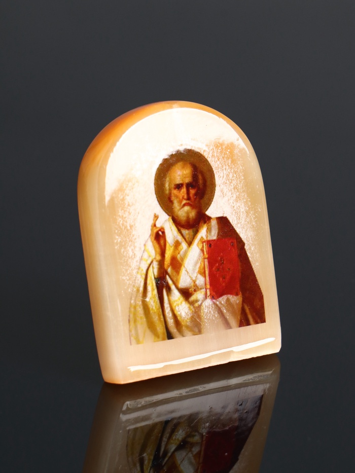 Эта небольшая икона из селенита с образом Николая Чудотворца станет вашим личным спутником. Её можно разместить на рабочем столе или домашнем киоте — она создаёт атмосферу умиротворения и напоминает о вере в течение дня.