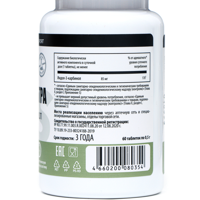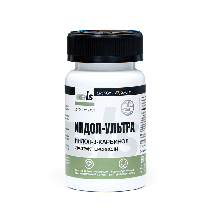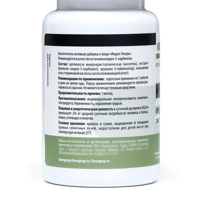 Индол-Ультра с экстрактом брокколи - это пищевая добавка в форме таблеток, каждая из которых содержит 500 мг индол-3-карбинола (И3К) и экстракта брокколи. Упаковка содержит 60 таблеток.