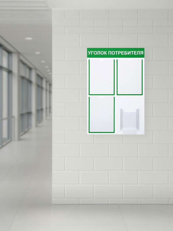 Организуйте уголок потребителя с четкой подачей всей необходимой информации, используя зеленый стенд с четырьмя специализированными карманами. Один объемный карман формата А5 предназначен для брошюр и каталогов, тогда как остальные три плоских кармана формата А4 предназначены для листовок, плакатов и иной печатной продукции. Устойчивый к влаге и механическим повреждениям, стенд легко монтируется на стену и становится незаменимым помощником в деле коммуникаций с клиентом.
