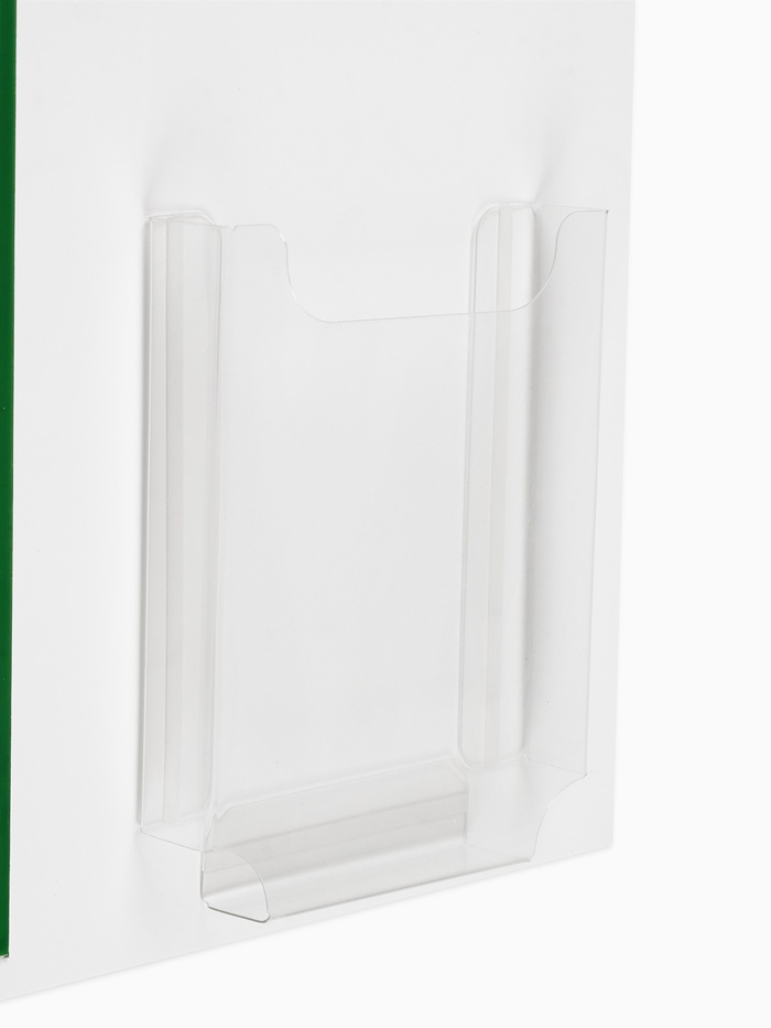 Функциональные особенности: Квадратный стенд со стороной 75 см укомплектован пятью плоскими прозрачными карманами для листов формата А4 и одним объёмным накопителем формата А5 для размещения Книги отзывов и предложений или нормативной литературы. Контрастный заголовок «УГОЛОК ПОТРЕБИТЕЛЯ» на зелёном фоне обеспечивает визуальное выделение информационной зоны в интерьере.