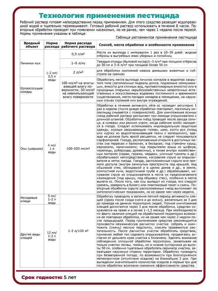 Средство для обработки участка от кровососущих клещей, комаров, ос, блох, тараканов, муравьев и других вредителей в доме и на участке. Препарат эффективен против вредителей, опасных для человека. Длительное время сохраняет эффективность на обработанных поверхностях. Прекрасно работает в жару, устойчив к смыванию водой.