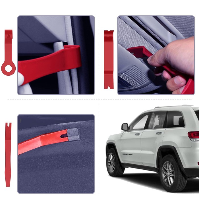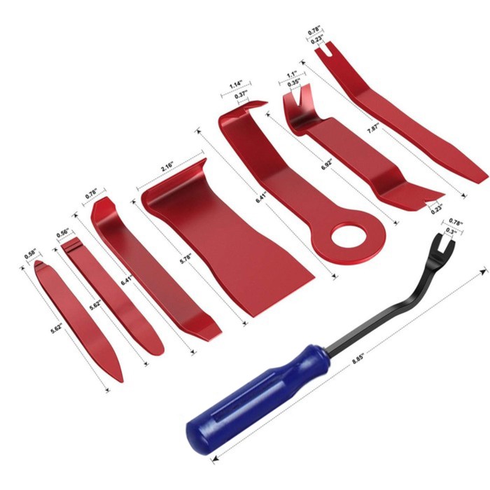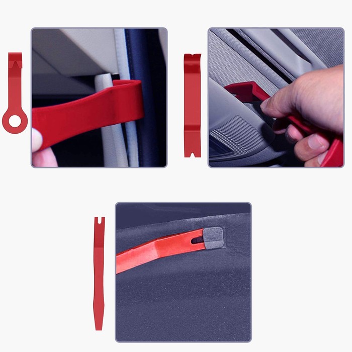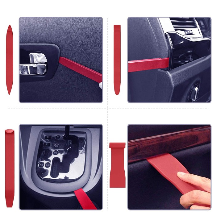 Комплект инструментов для разборки салона автомобиля позволяет аккуратно, без повреждения элементов, провести демонтаж панелей дверей, потолка, торпедо и других пластиковых частей внутренней отделки, а также магнитол и любых других компонентов. В наборе 8 предметов — вилки, лопатки