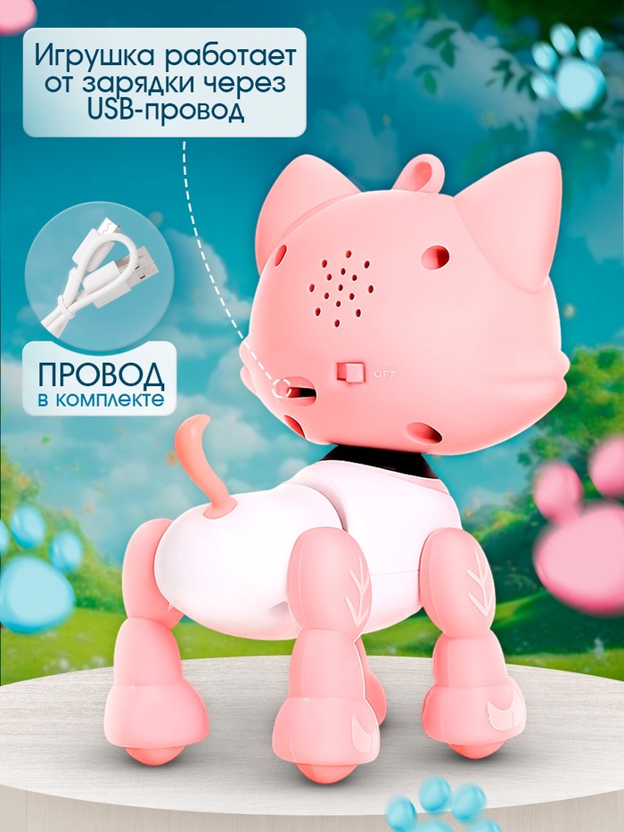 Электронный питомец имеет сенсорные датчики на теле. От прикосновения к ним кошечка выполняет разные действия. Стоит только подуть на неё, она замигает хвостиком и завиляет. А если её погладить — она обрадуется своему новому хозяину! А ещё станцует, когда вы хлопните в ладоши перед ней.