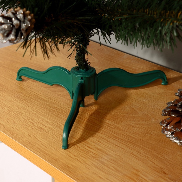 Настольная зелёная ёлка высотой 60 см с отгибающимися ПВХ-ветками украшена серебристыми шишками, создавая сдержанный и в то же время праздничный образ. Её дизайн гармонично вписывается в различные стили интерьера — от классики и скандинавского до ар-деко и новогоднего барокко.
