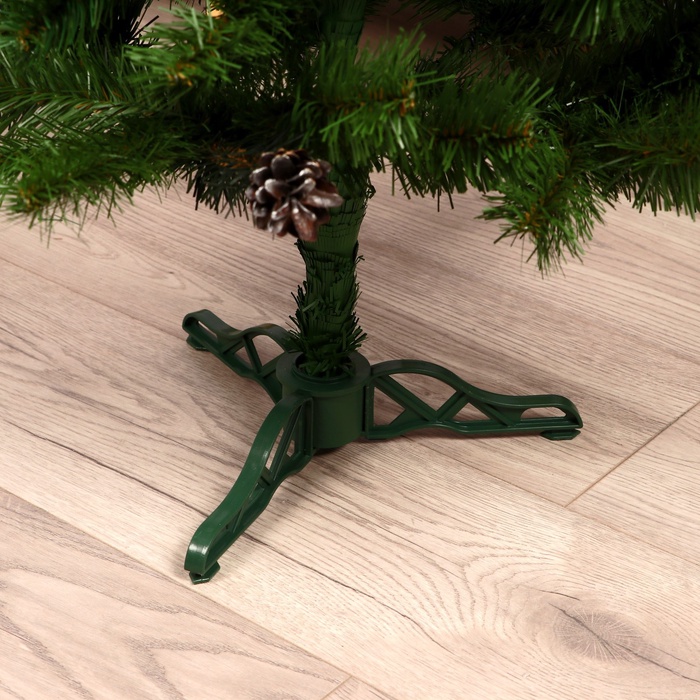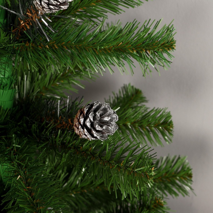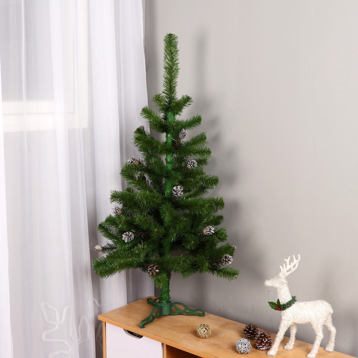 Компактная напольная ёлка высотой 100 см с отгибающимися ПВХ ветками и натуральным декором из коричневых шишек создаёт уютную атмосферу зимнего праздника. Её насыщенная зелёная хвоя гармонично вписывается в разные стилистические решения — от классики до скандинавского и ар-деко.