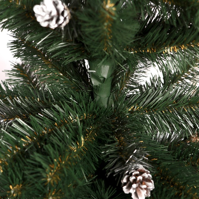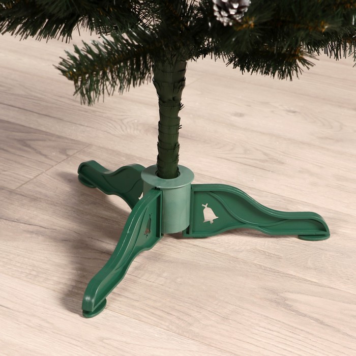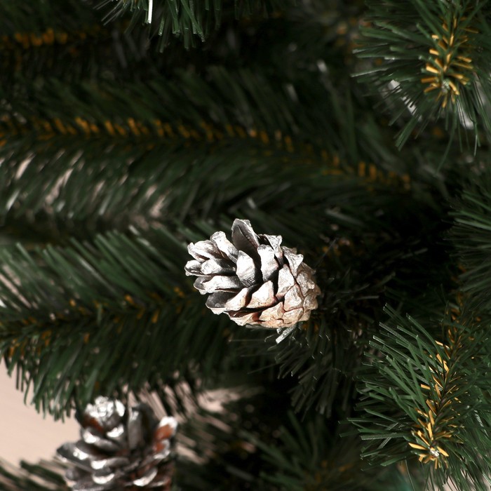 Компактная искусственная ёлка высотой 120 см с отгибающимися ПВХ ветками и зелёной хвоей дополнена коричневыми шишками. Эта модель сочетает в себе элементы классики, скандинавского и ар-деко стилей, создавая естественную атмосферу зимнего леса в домашнем интерьере.