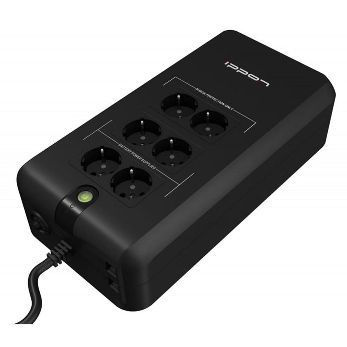 Ippon Back Verso 800 обеспечит бесперебойную подачу энергии и защитит от высоковольтных выбросов, электромагнитных и радиочастотных помех, понижений, повышений и полного исчезновения напряжения в сети. При сбоях источник переводит оборудование на питание от резервного аккумулятора, который поддерживает функционирование подключённых устройств на протяжении определённого времени. Прибор имеет компактные размеры и небольшой вес, что позволяет разместить его в границах рабочего пространства.